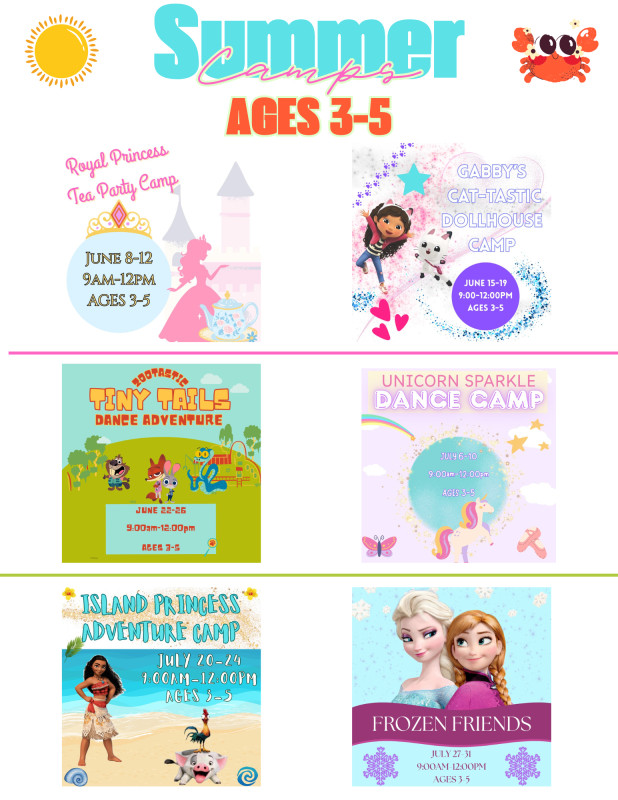 Get ready for a week of snowy sparkle and magical fun at Frozen Friends Dance Camp! Little dancers will twirl through a winter wonderland filled with dancing, imagination, and friendship. Each day will include themed dance classes, creative movement, fun games, and special crafts inspired by icy adventures and beloved Frozen friends. Please pack a labeled water bottle. Snack is provided.